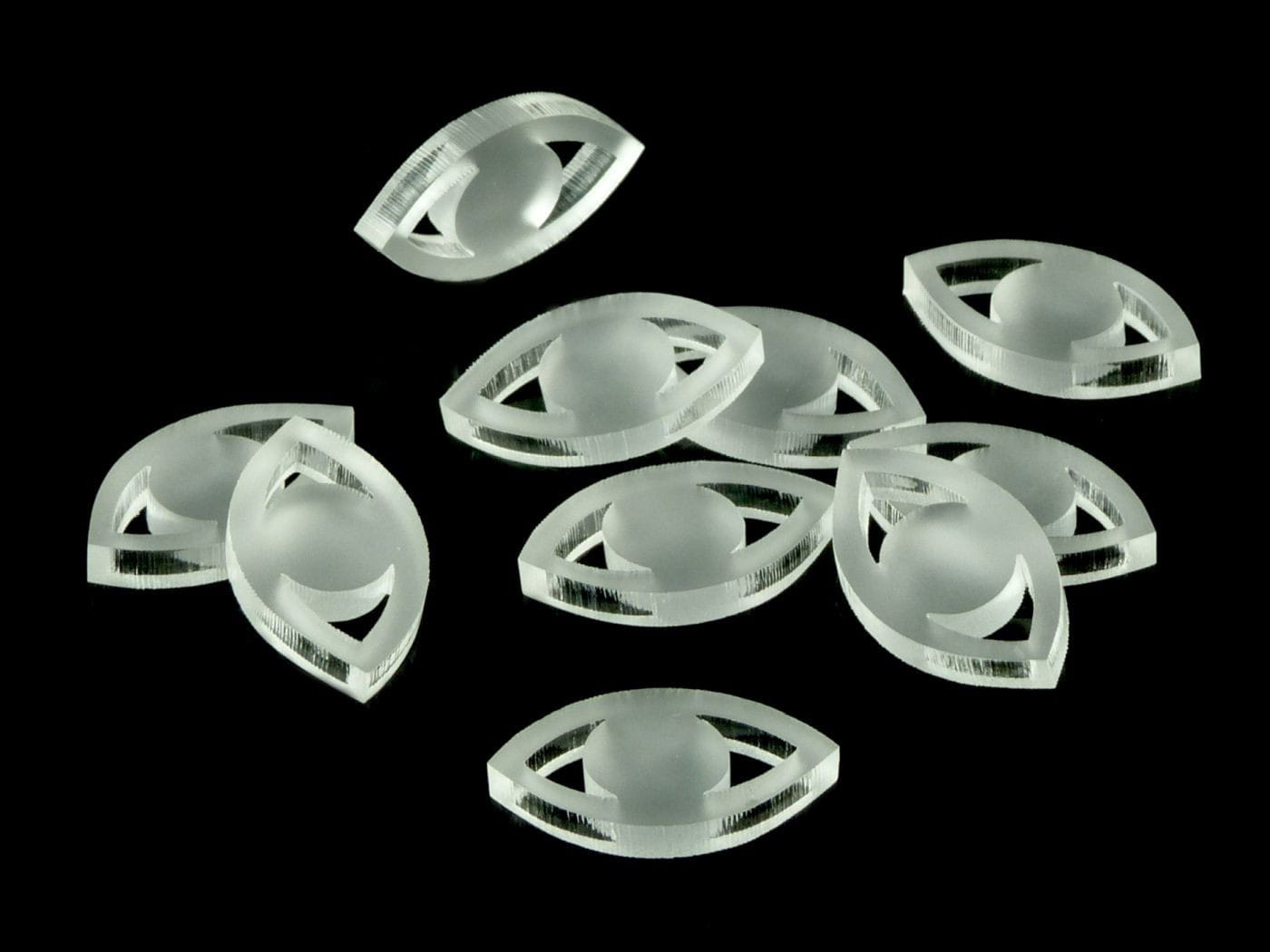Zestaw 10 oczu o dłuższym wymiarze około 22 mm, wykonanych ze szkła akrylowego o grubości 3 mm.