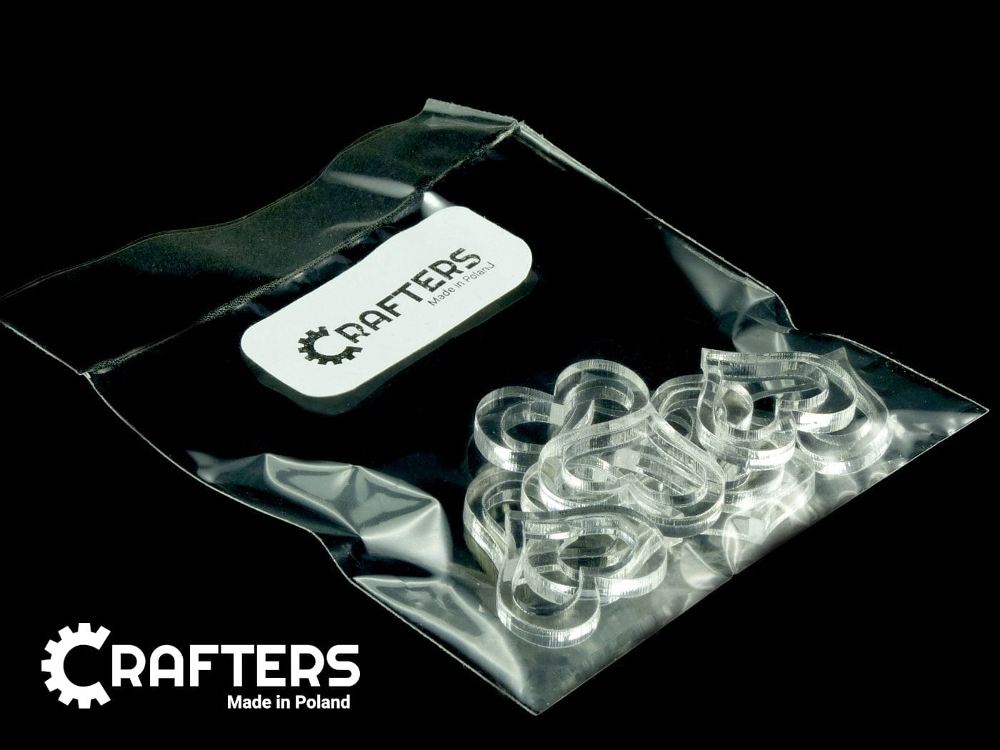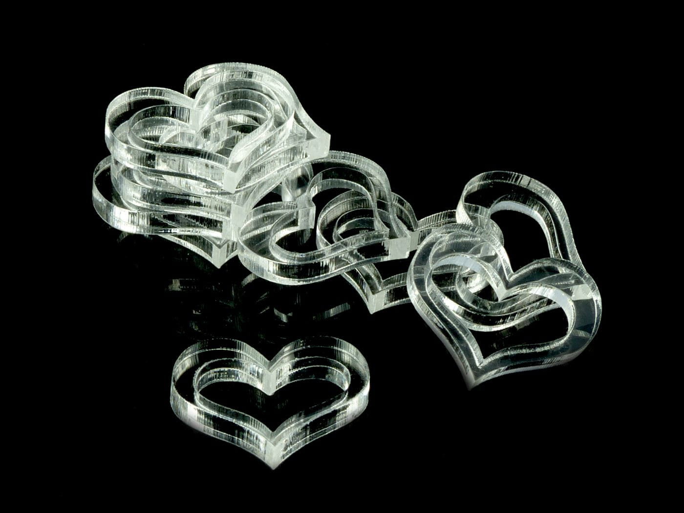 Zestaw 10 serc (pustych) o wymiarze 22 mm, wykonanych ze szkła akrylowego o grubości 3 mm.