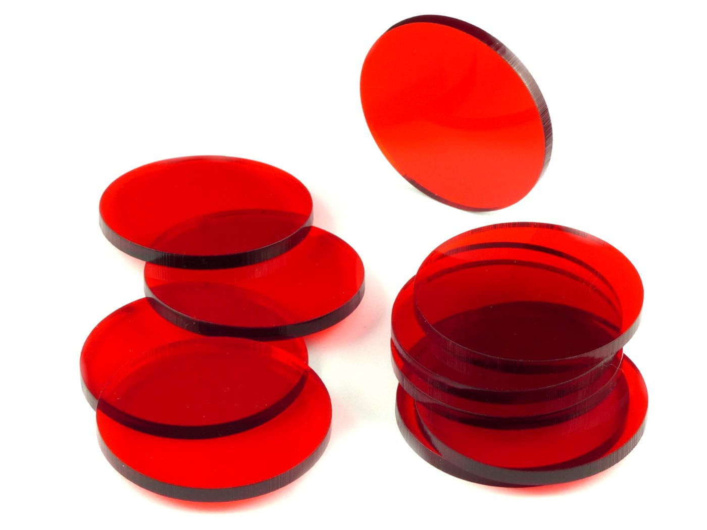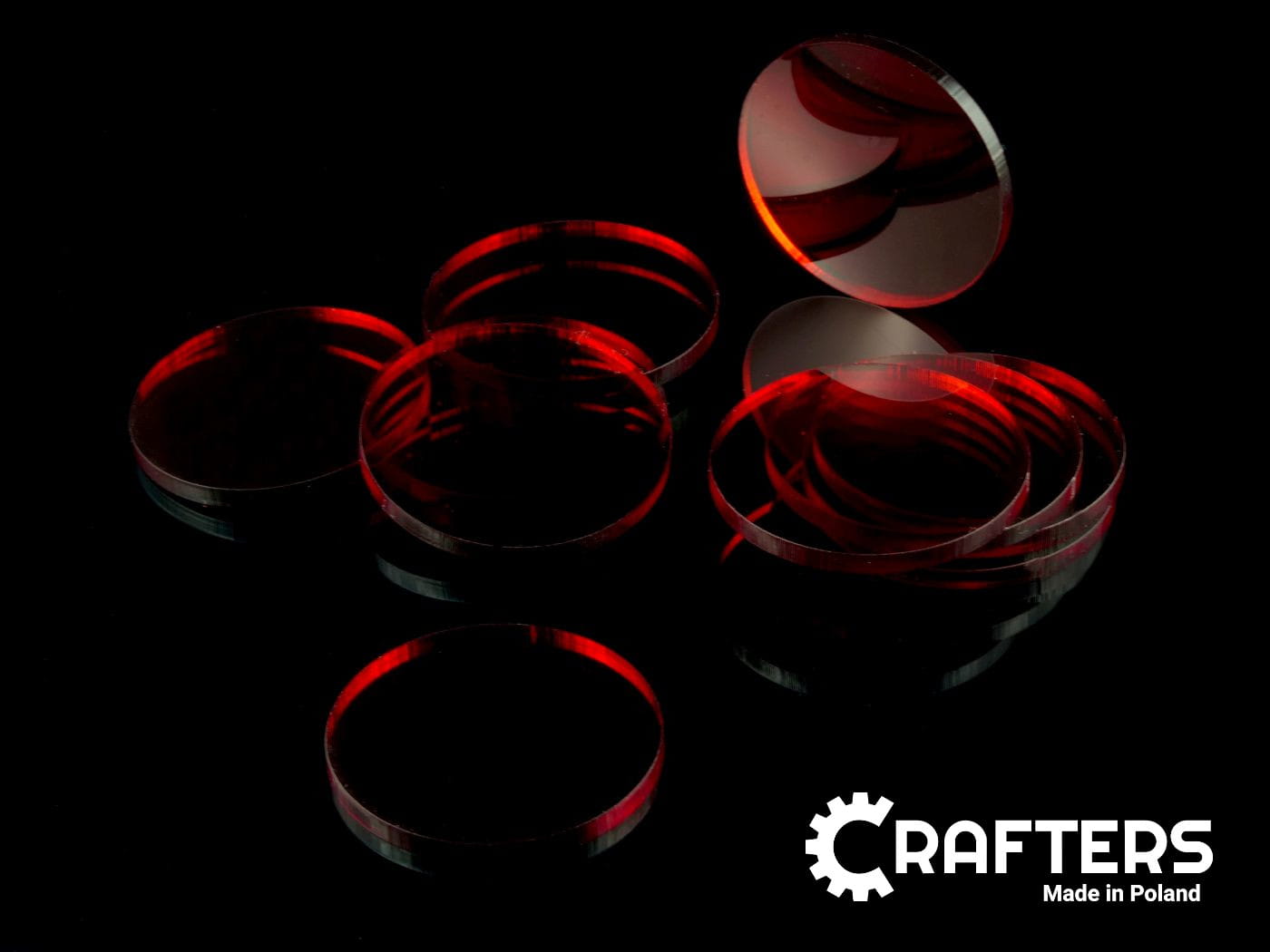 Zestaw 10 kół o średnicy 40 mm, wykonanych ze szkła akrylowego o grubości 3 mm.