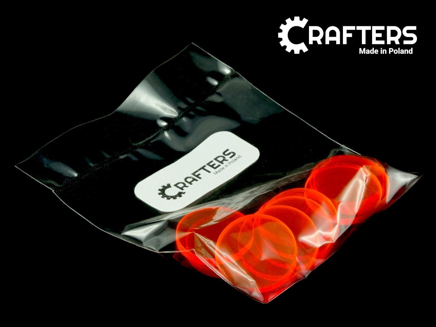 Zestaw 10 kół o średnicy 22 mm, wykonanych ze szkła akrylowego o grubości 3 mm. Materiał, z którego wycięte są kształty załamuje światło w sposób dający efekt poświaty na brzegach.