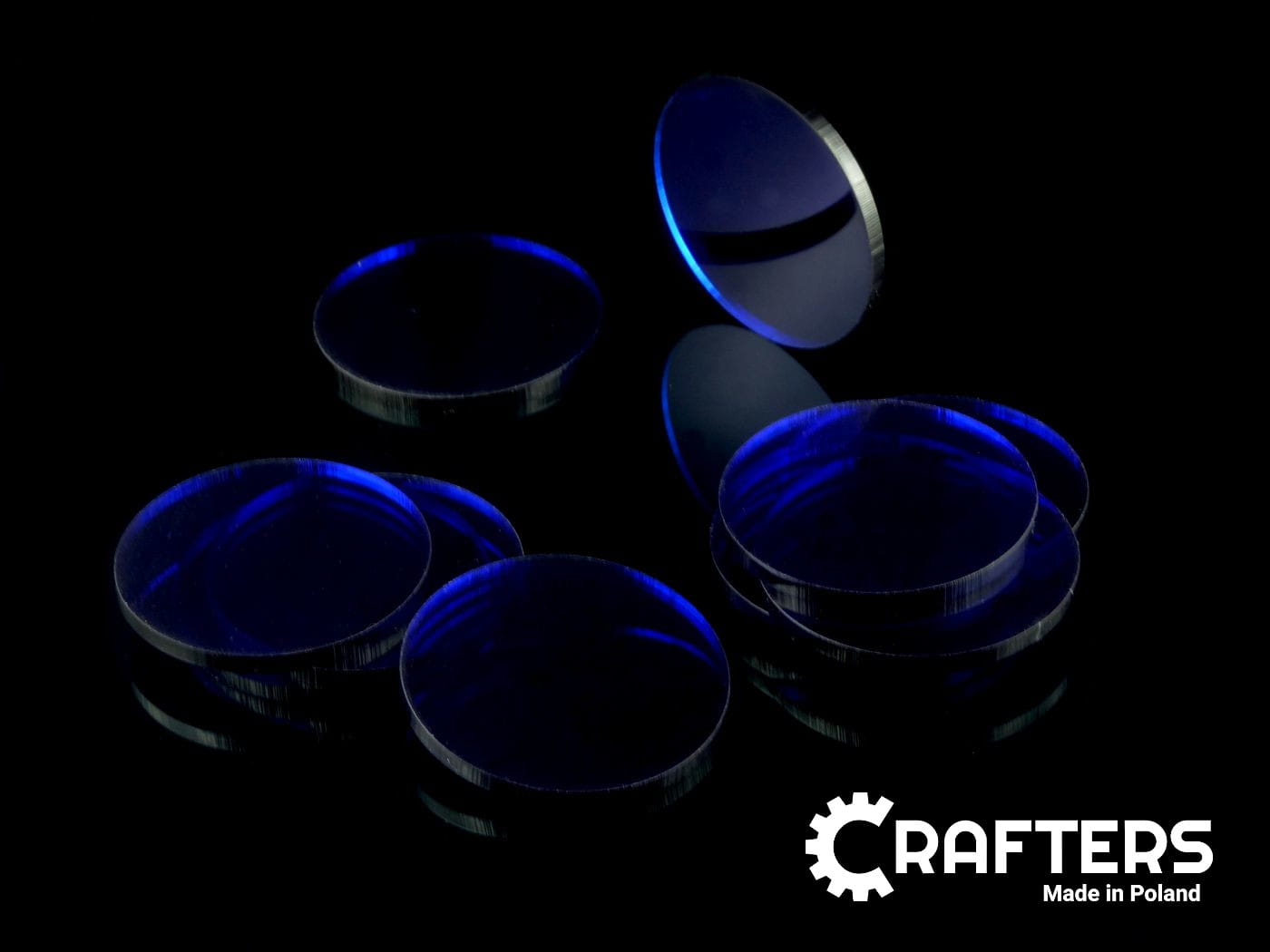 Zestaw 10 kół o średnicy 50 mm, wykonanych ze szkła akrylowego o grubości 3 mm.
