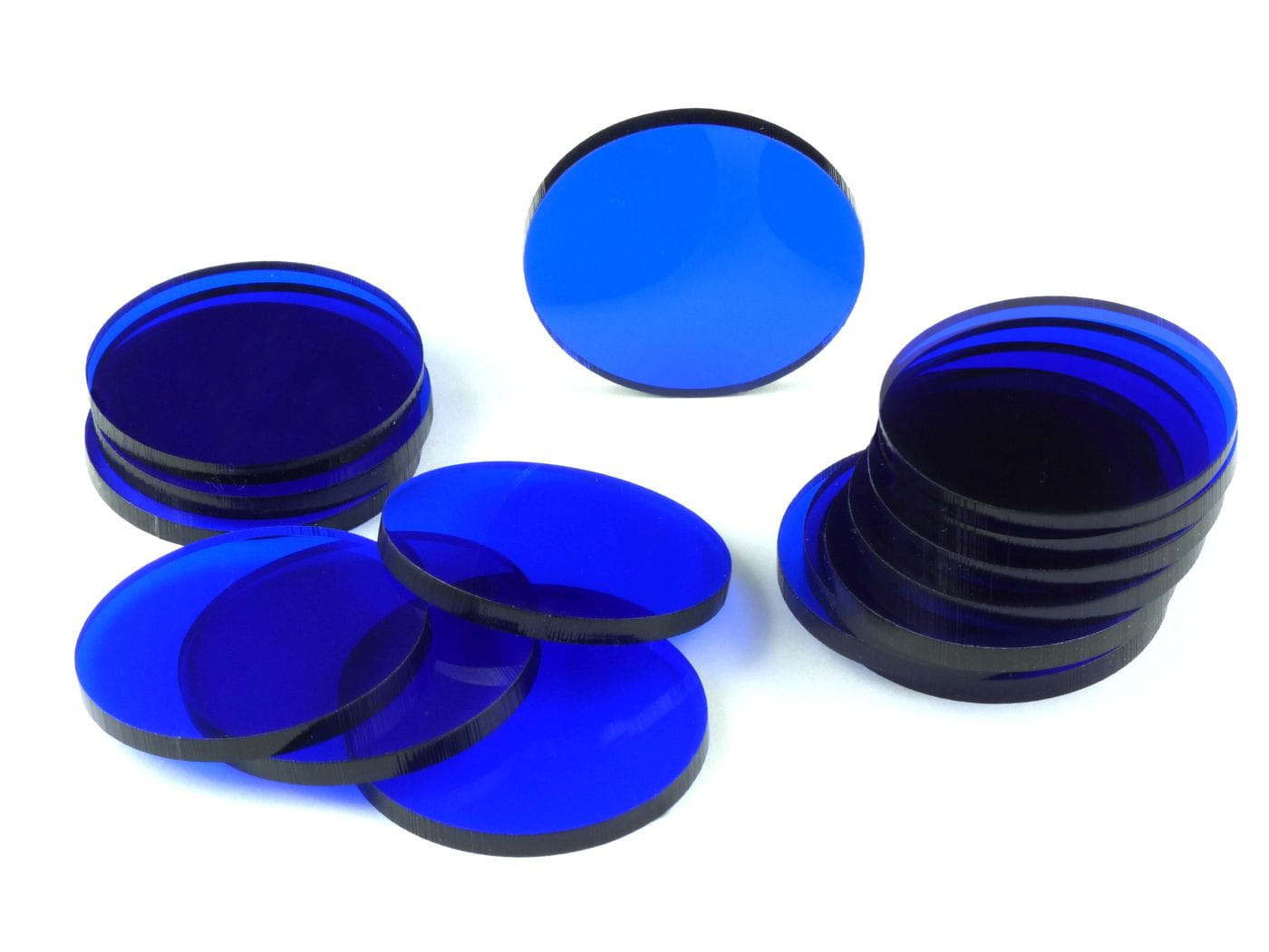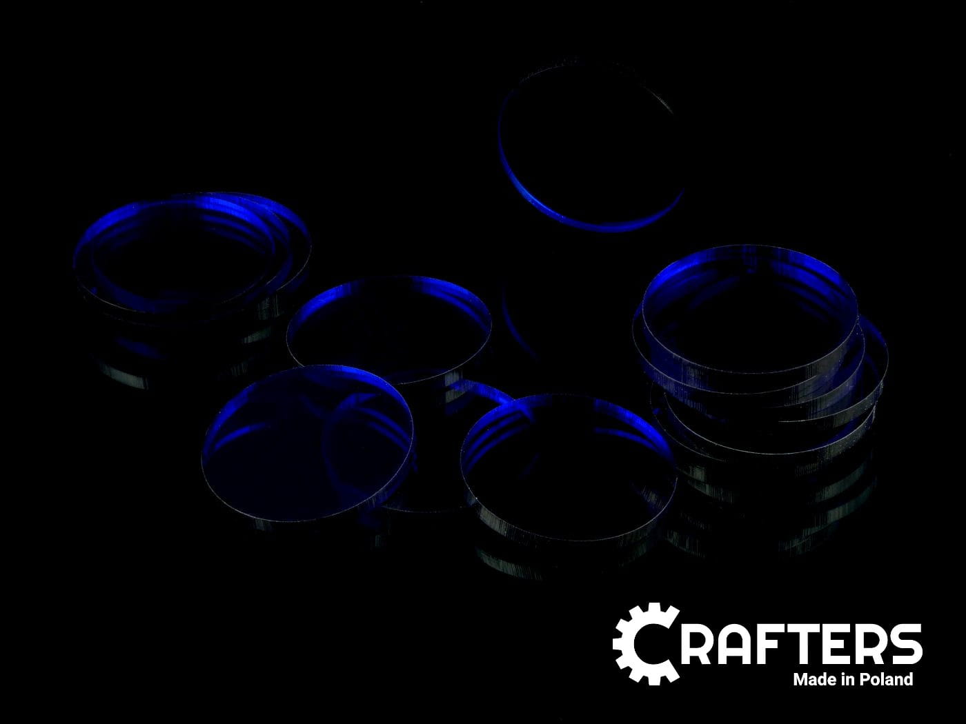 Zestaw 15 kół o średnicy 30 mm, wykonanych ze szkła akrylowego o grubości 3 mm.