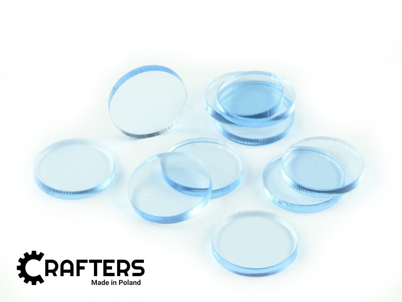 Zestaw 10 kół o średnicy 22 mm, wykonanych ze szkła akrylowego o grubości 3 mm. Materiał, z którego wycięte są kształty załamuje światło w sposób dający efekt poświaty na brzegach.