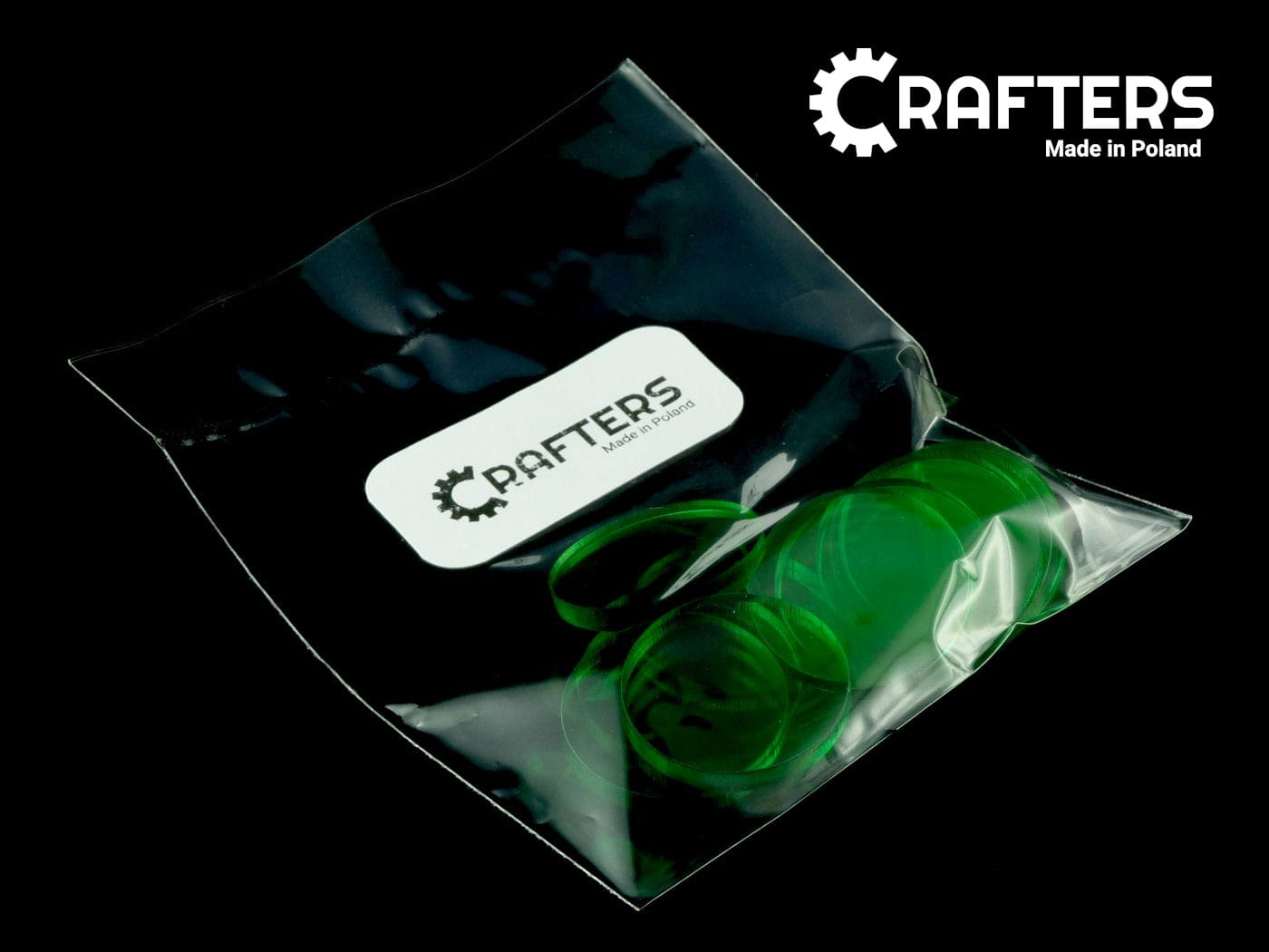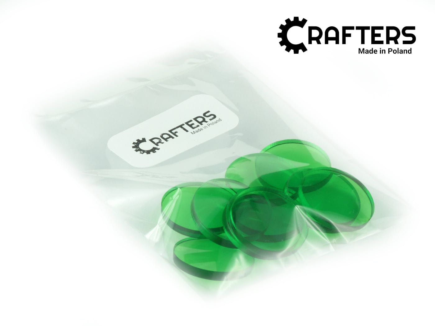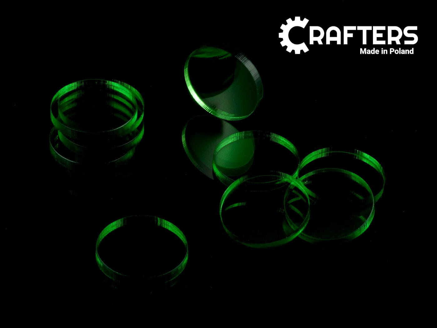Zestaw 10 kół o średnicy 22 mm, wykonanych ze szkła akrylowego o grubości 3 mm.