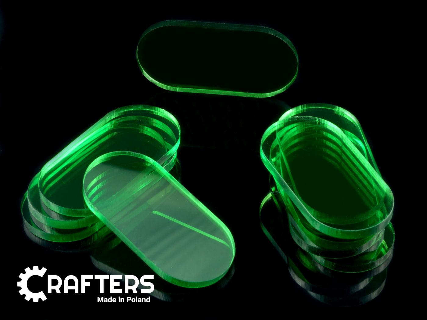 Kształty akrylowe - transparentne, zielone, 10 sztuk, pigułka, 25x50x3 mm