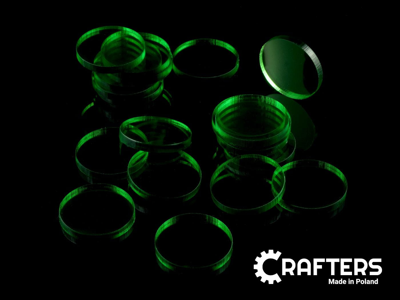 Zestaw 20 kół o średnicy 25 mm, wykonanych ze szkła akrylowego o grubości 3 mm.
