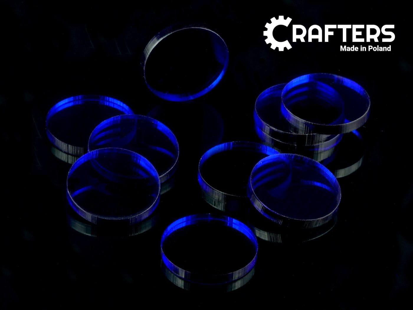 Zestaw 10 kół o średnicy 22 mm, wykonanych ze szkła akrylowego o grubości 3 mm.