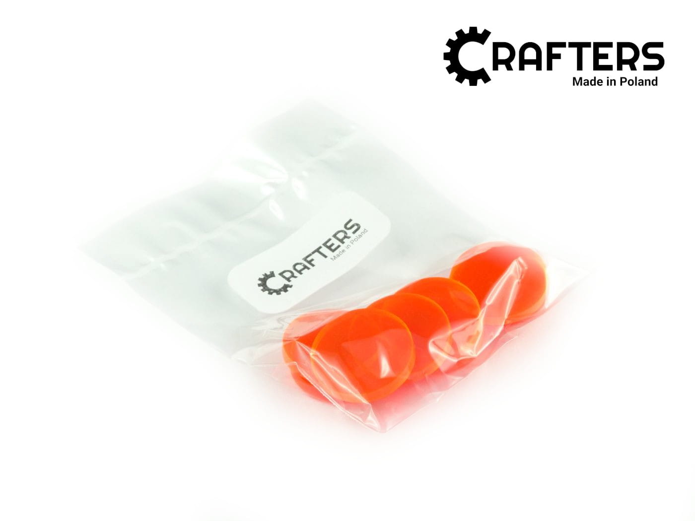 Żetony wykonane z czerwonego szkła akrylowego, fluorescencyjnego, o grubości 3 mm, średnica żetonu wynosi 22 mm. W opakowaniu jest 10 żetonów. Użyteczne w grach bitewnych, RPG, grach Print & Play, w prototypach gier planszowych, jako zamienniki elementów oraz przy wprowadzaniu własnych modyfikacji zasad do gier. Po żetonach można kreślić mazakami suchościeralnymi.
