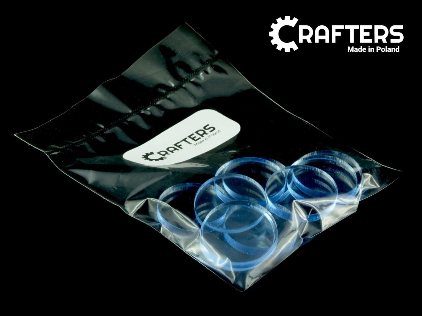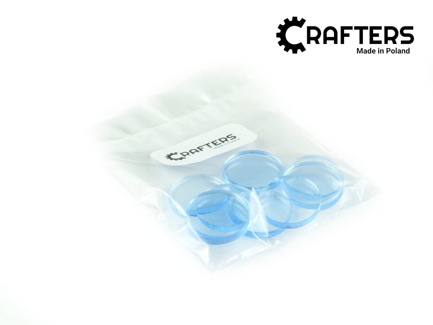 Żetony wykonane z niebieskiego szkła akrylowego fluorescencyjnego o grubości 3 mm, średnica żetonu wynosi 22 mm. W opakowaniu jest 10 żetonów. Użyteczne w grach bitewnych, RPG, grach Print & Play, w prototypach gier planszowych, jako zamienniki elementów oraz przy wprowadzaniu własnych modyfikacji zasad do gier. Po żetonach można kreślić mazakami suchościeralnymi.