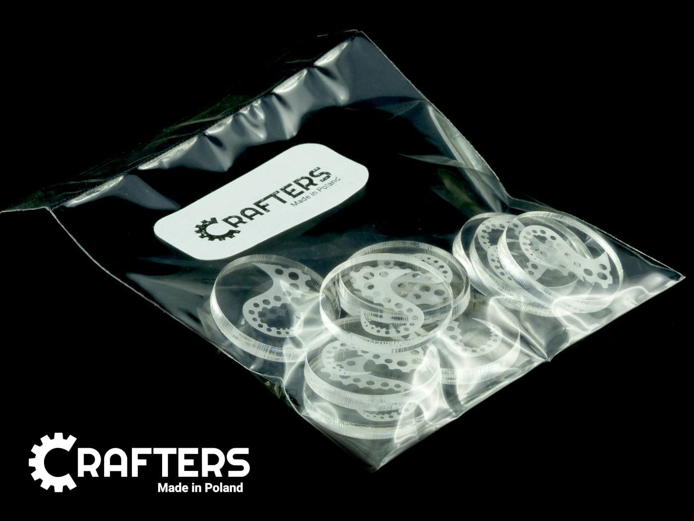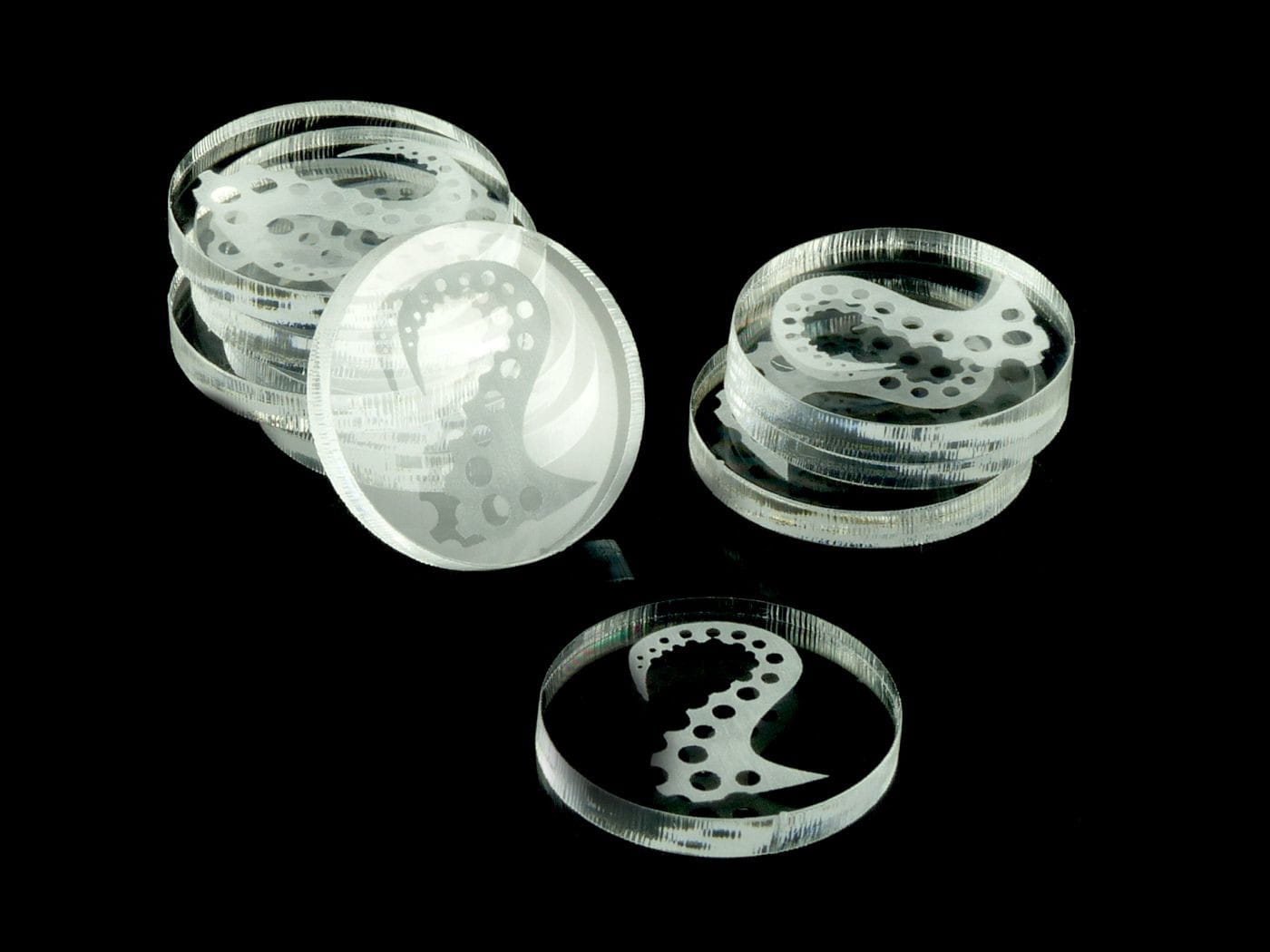 Żetony z wygrawerowaną grafiką macki w pierwszej wersji, wykonane ze szkła akrylowego przezroczystego, o grubości 3 mm, średnica żetonu wynosi 22 mm. W opakowaniu jest 10 żetonów. Użyteczne w grach bitewnych, RPG, grach Print & Play, w prototypach gier planszowych, jako zamienniki elementów oraz przy wprowadzaniu własnych modyfikacji zasad do gier.