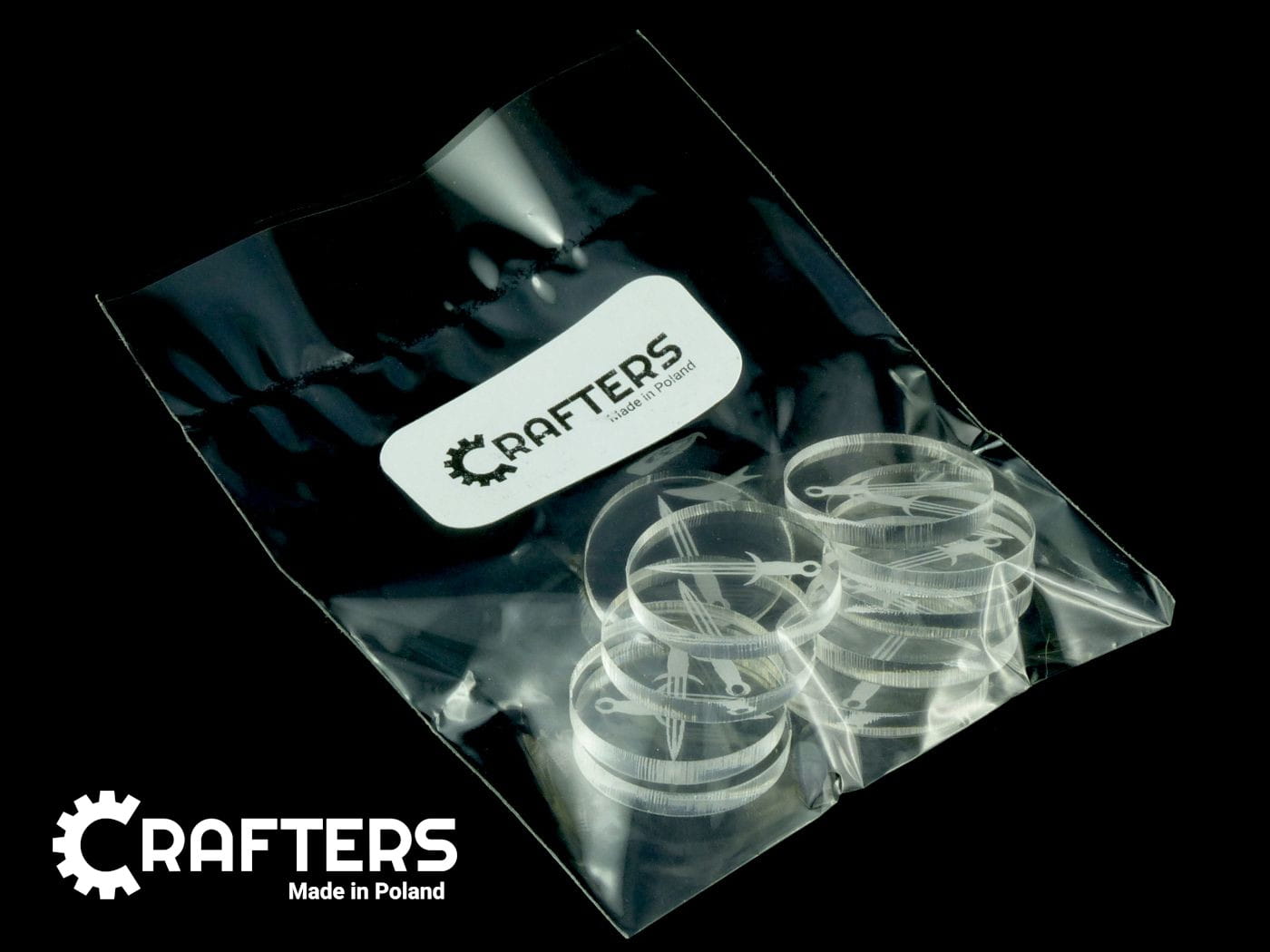 Żetony z wygrawerowaną grafiką miecza, wykonane ze szkła akrylowego przezroczystego, o grubości 3 mm, średnica żetonu wynosi 22 mm. W opakowaniu jest 10 żetonów. Użyteczne w grach bitewnych, RPG, grach Print & Play, w prototypach gier planszowych, jako zamienniki elementów oraz przy wprowadzaniu własnych modyfikacji zasad do gier.
