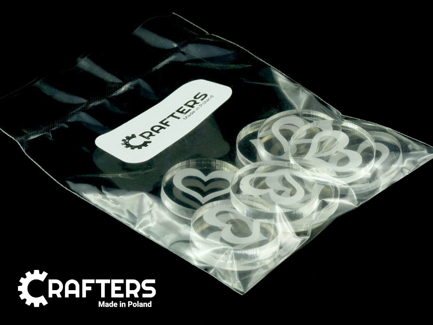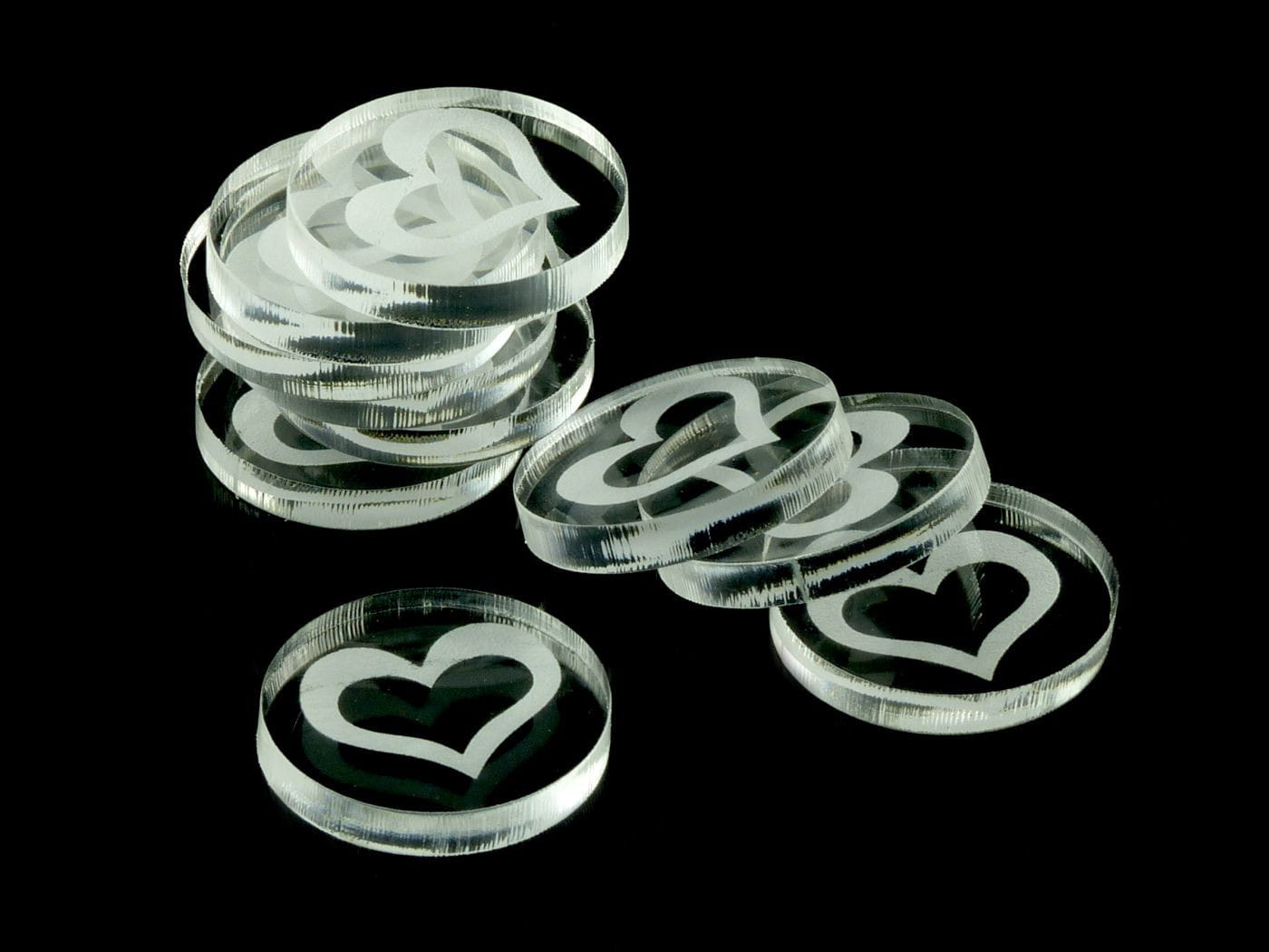Żetony z wygrawerowaną grafiką serca, wykonane ze szkła akrylowego przezroczystego, o grubości 3 mm, średnica żetonu wynosi 22 mm. W opakowaniu jest 10 żetonów. Użyteczne w grach bitewnych, RPG, grach Print & Play, w prototypach gier planszowych, jako zamienniki elementów oraz przy wprowadzaniu własnych modyfikacji zasad do gier.