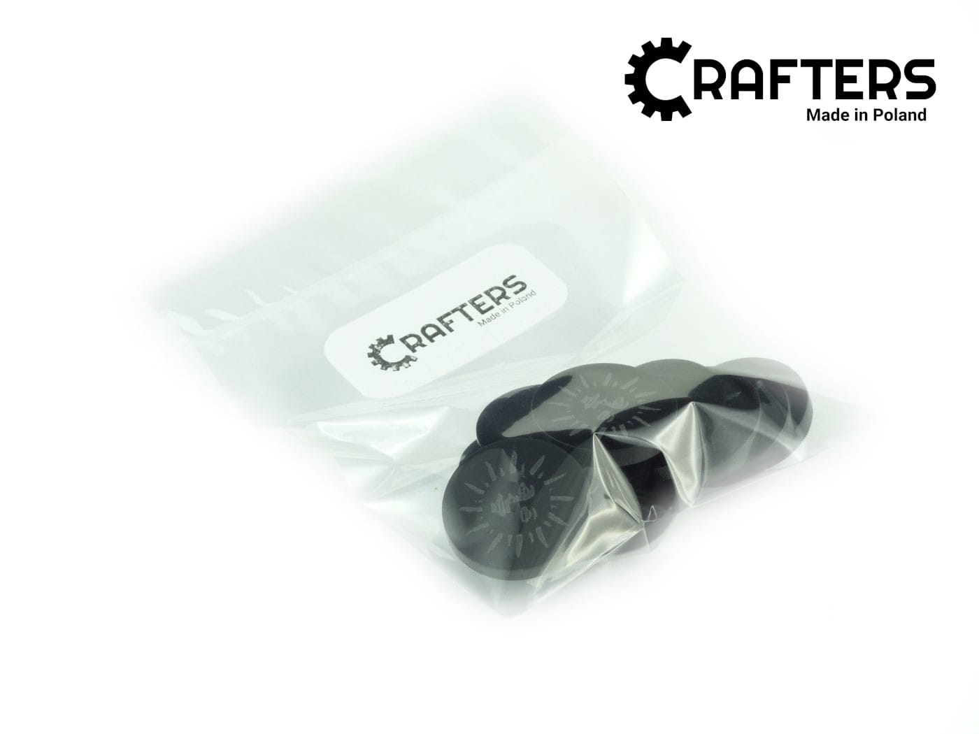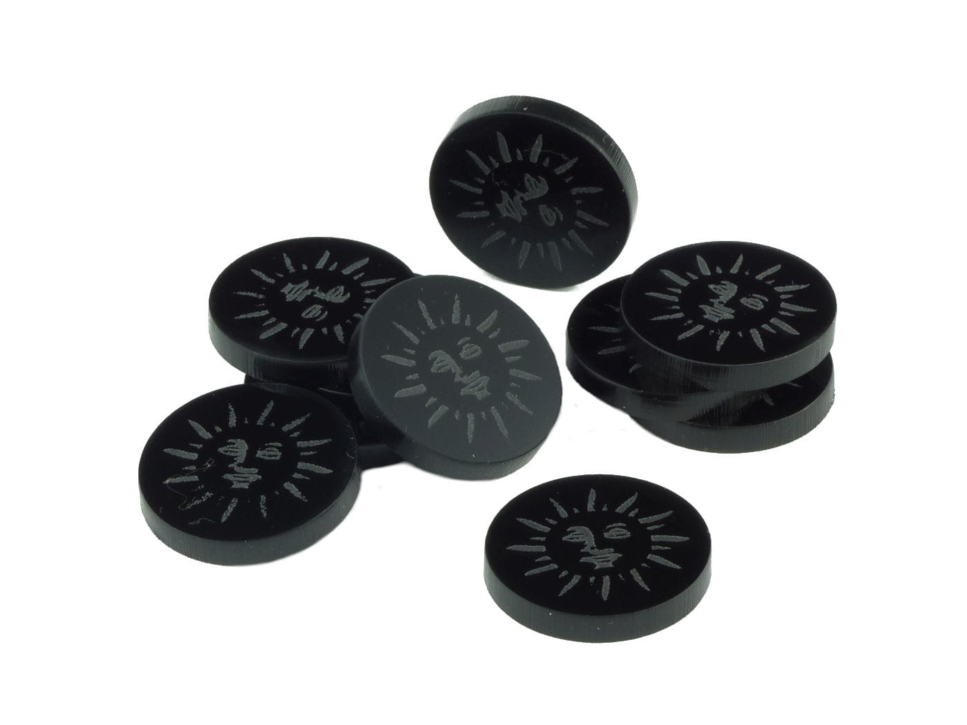 Żetony z wygrawerowaną grafiką słońca, wykonane z czarnego szkła akrylowego, o grubości 3 mm, średnica żetonu wynosi 22 mm. W opakowaniu jest 10 żetonów. Użyteczne w grach bitewnych, RPG, grach Print & Play, w prototypach gier planszowych, jako zamienniki elementów oraz przy wprowadzaniu własnych modyfikacji zasad do gier.