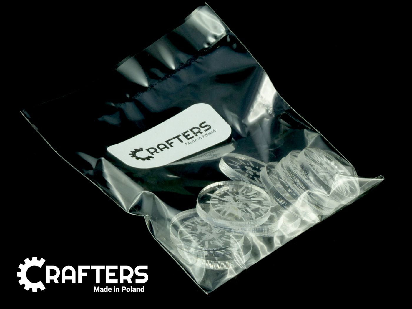 Żetony z wygrawerowaną grafiką korony, wykonane ze szkła akrylowego przezroczystego, o grubości 3 mm, średnica żetonu wynosi 22 mm. W opakowaniu jest 10 żetonów. Użyteczne w grach bitewnych, RPG, grach Print & Play, w prototypach gier planszowych, jako zamienniki elementów oraz przy wprowadzaniu własnych modyfikacji zasad do gier.