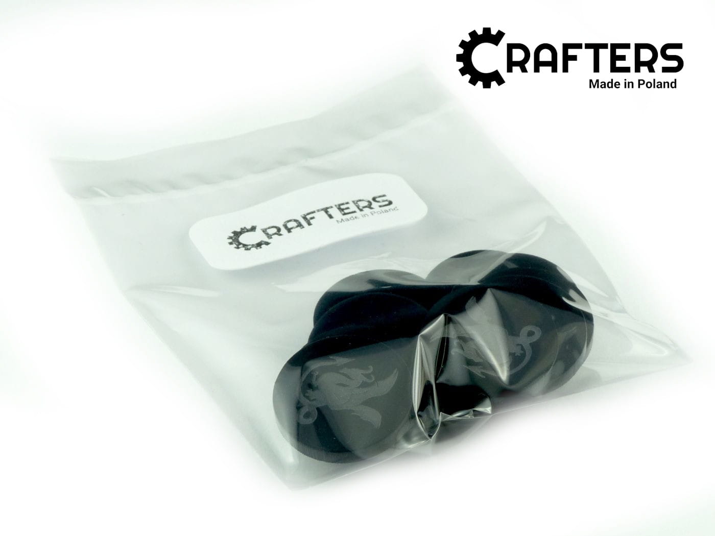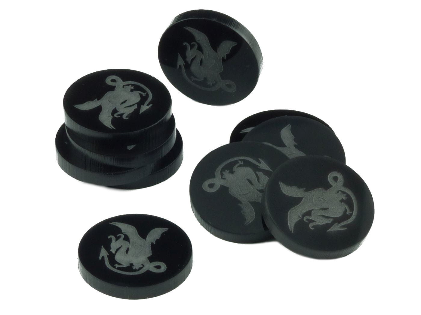 Żetony z wygrawerowaną grafiką smoka w pierwszej wersji, wykonane z czarnego szkła akrylowego, o grubości 3 mm, średnica żetonu wynosi 22 mm. W opakowaniu jest 10 żetonów. Użyteczne w grach bitewnych, RPG, grach Print & Play, w prototypach gier planszowych, jako zamienniki elementów oraz przy wprowadzaniu własnych modyfikacji zasad do gier.