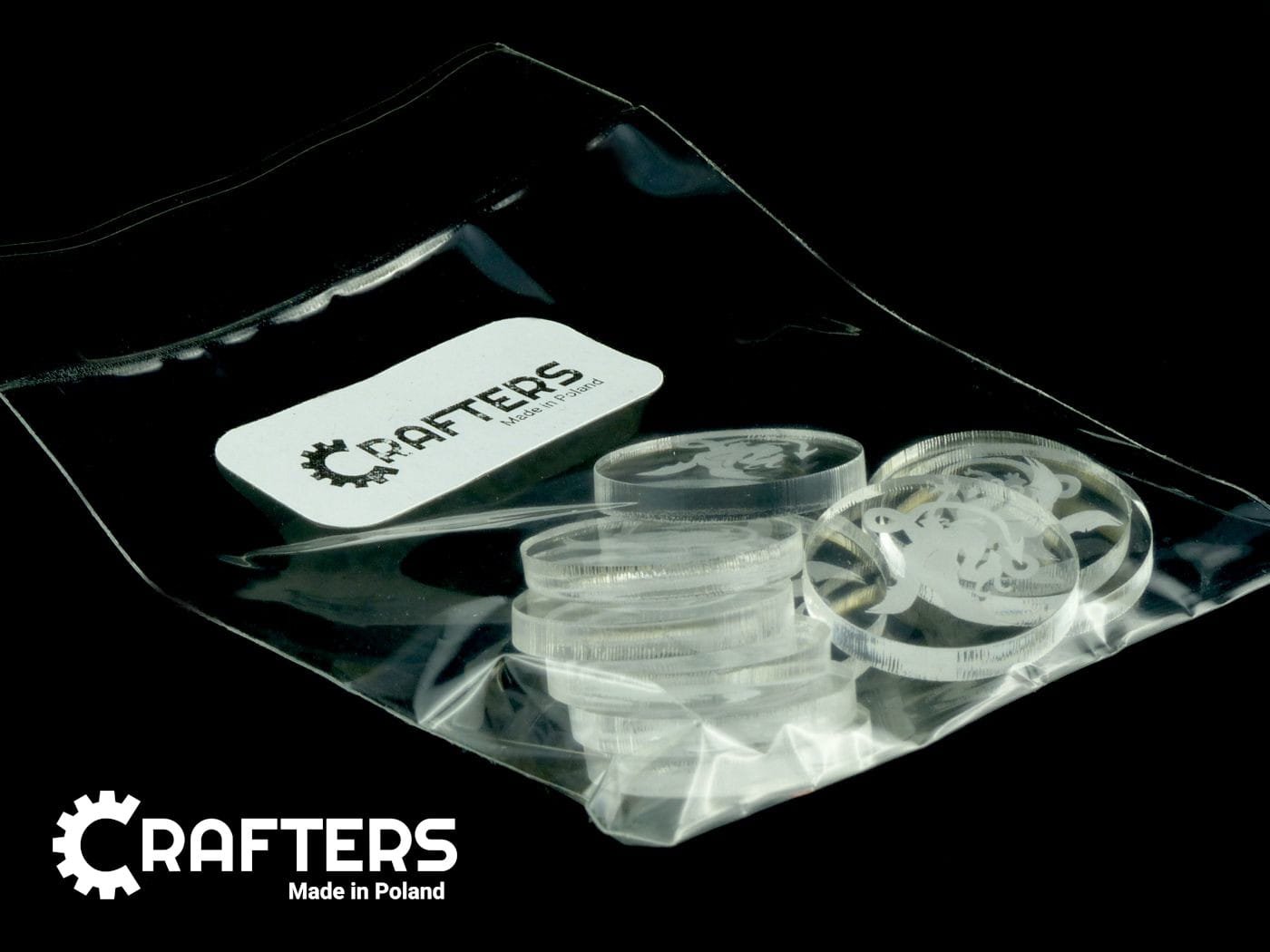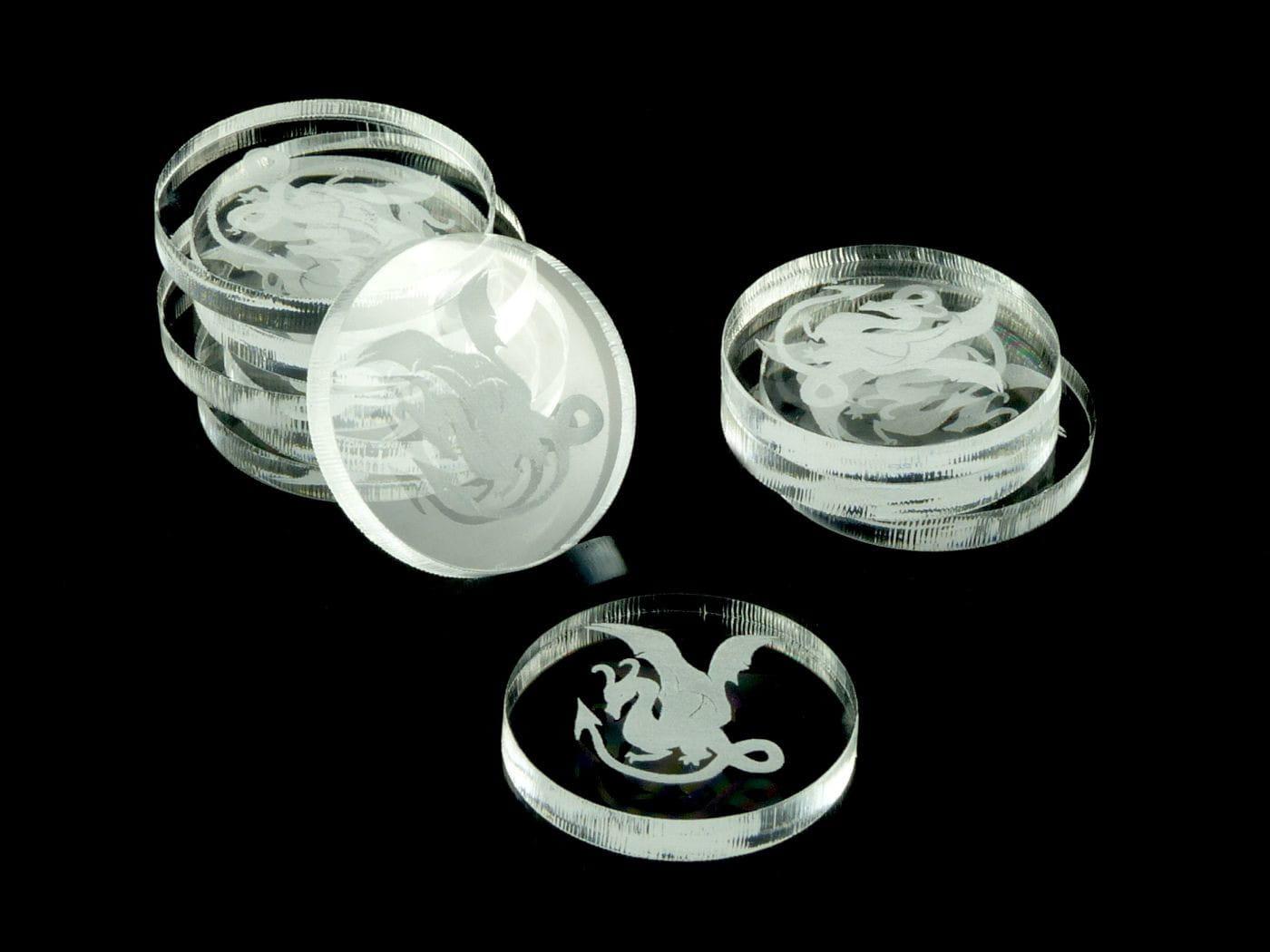 Żetony z wygrawerowaną grafiką smoka w pierwszej wersji, wykonane ze szkła akrylowego przezroczystego, o grubości 3 mm, średnica żetonu wynosi 22 mm. W opakowaniu jest 10 żetonów. Użyteczne w grach bitewnych, RPG, grach Print & Play, w prototypach gier planszowych, jako zamienniki elementów oraz przy wprowadzaniu własnych modyfikacji zasad do gier.
