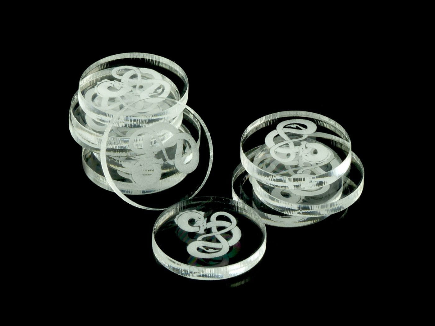 Żetony z wygrawerowaną grafiką smoka w drugiej wersji, wykonane ze szkła akrylowego przezroczystego, o grubości 3 mm, średnica żetonu wynosi 22 mm. W opakowaniu jest 10 żetonów. Użyteczne w grach bitewnych, RPG, grach Print & Play, w prototypach gier planszowych, jako zamienniki elementów oraz przy wprowadzaniu własnych modyfikacji zasad do gier.