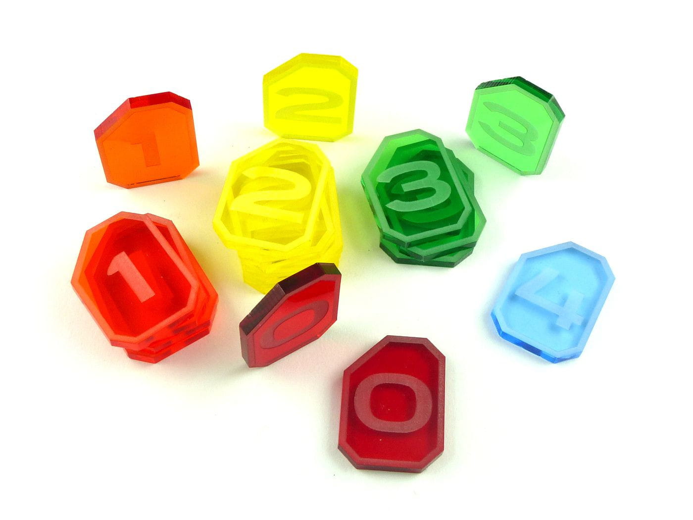 Zestaw 18 żetonów zastępujących talię Powodzenia Misji. Dzięki nim starty stają się szybsze, bez konieczności każdorazowego tasowania kart. Losujemy żeton, a po zakończeniu wystrzelenia, wrzucamy wszystkie wyciągnięte żetony z powrotem do worka/naczynia. Przypisane kolory pomagają szybko identyfikować wartość na żetonie.