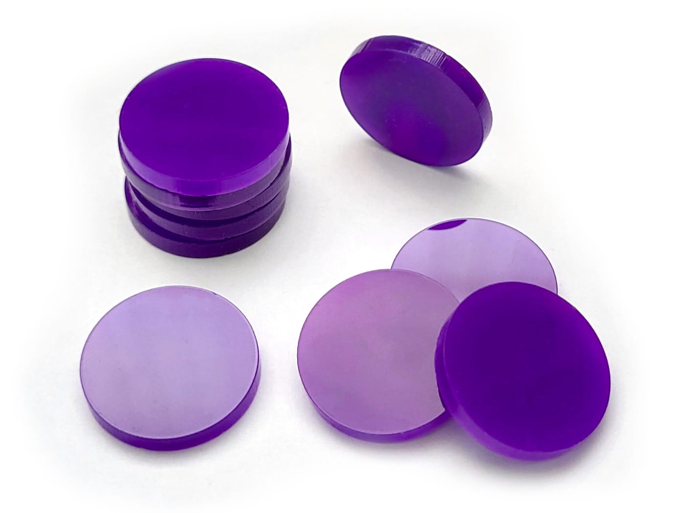 Zestaw 10 żetonów o średnicy 22 mm, wykonanych ze szkła akrylowego o grubości 3 mm.