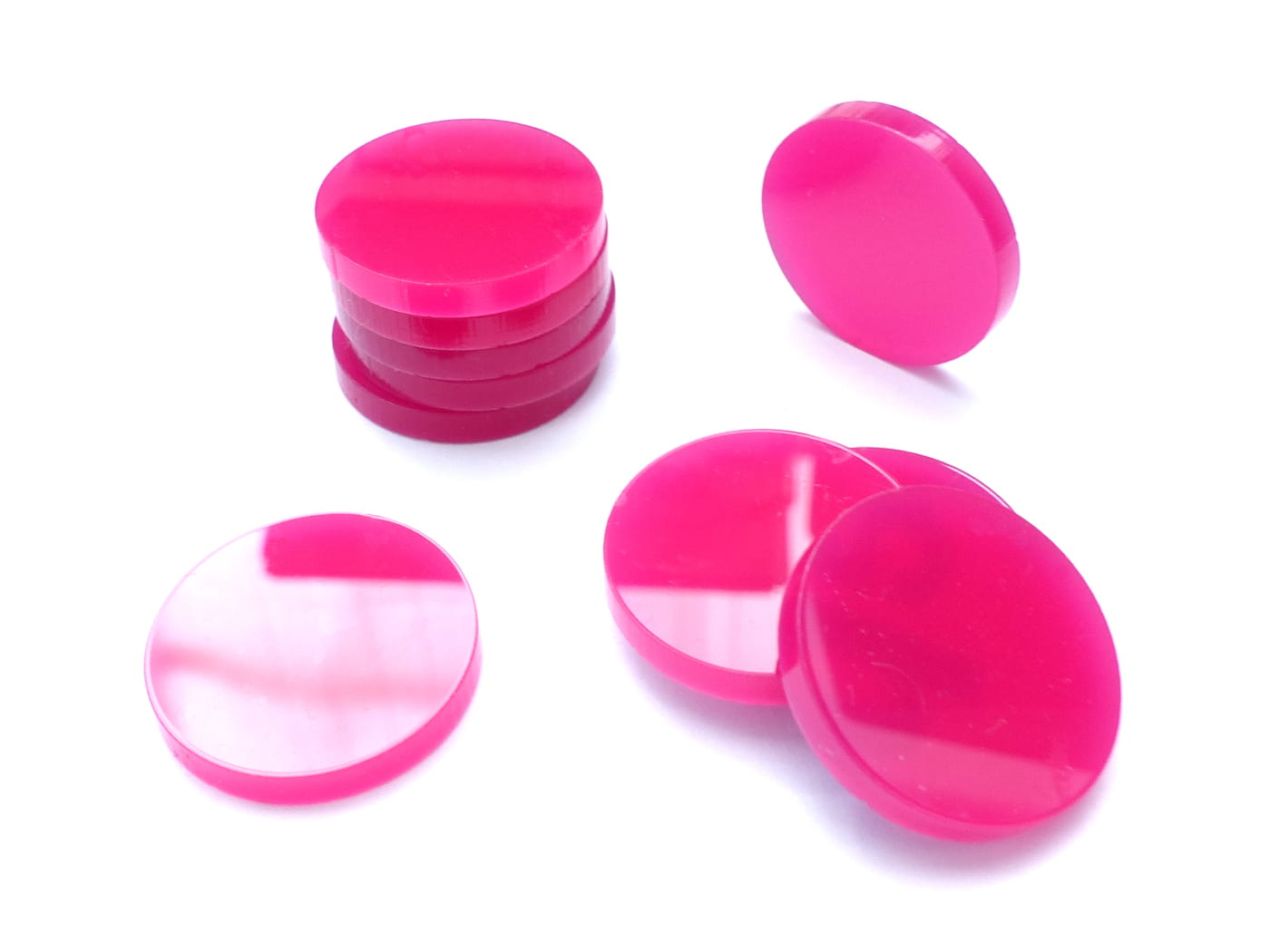 Zestaw 10 żetonów o średnicy 22 mm, wykonanych ze szkła akrylowego o grubości 3 mm.
