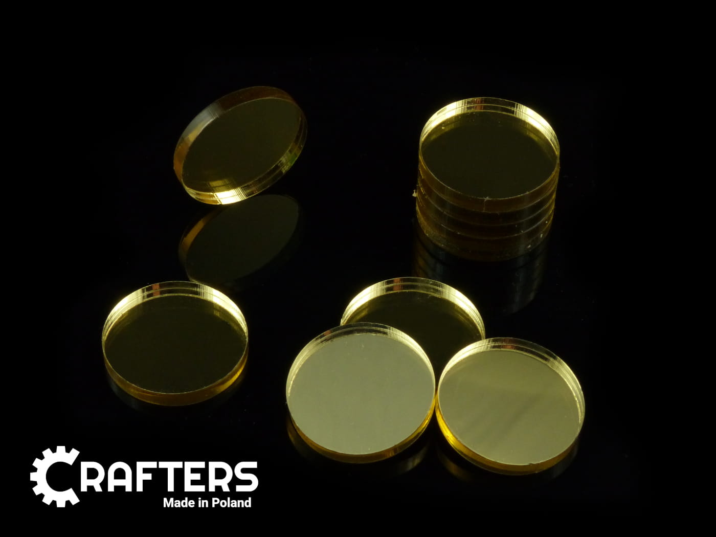 Zestaw 10 żetonów o średnicy 22 mm, wykonanych ze szkła akrylowego o grubości 3 mm. Powierzchnia lustrzana po jednej stronie. Znaczniki będą użyteczne w grach bitewnych, RPGach, grach Print & Play, w prototypach gier planszowych, jako zamienniki elementów oraz przy wprowadzaniu własnych modyfikacji zasad do gier. Po żetonach można pisać mazakami suchościeralnymi.