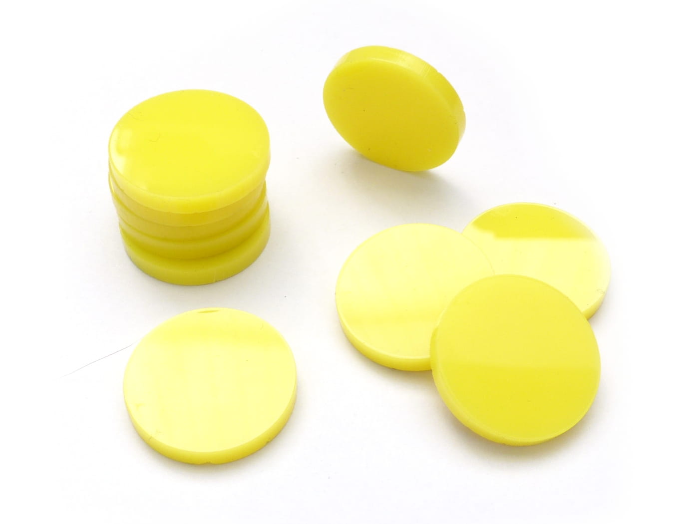 Zestaw 10 żetonów o średnicy 22 mm, wykonanych ze szkła akrylowego o grubości 3 mm.